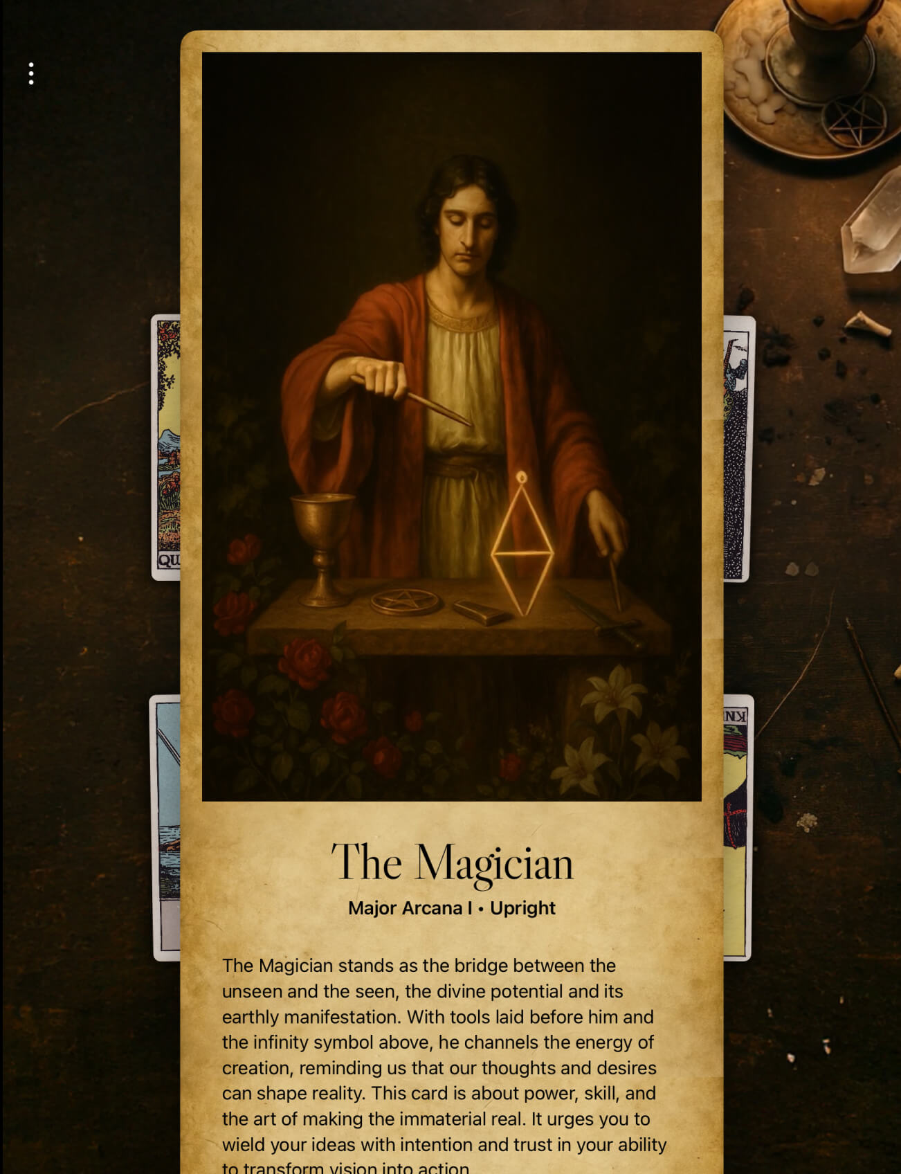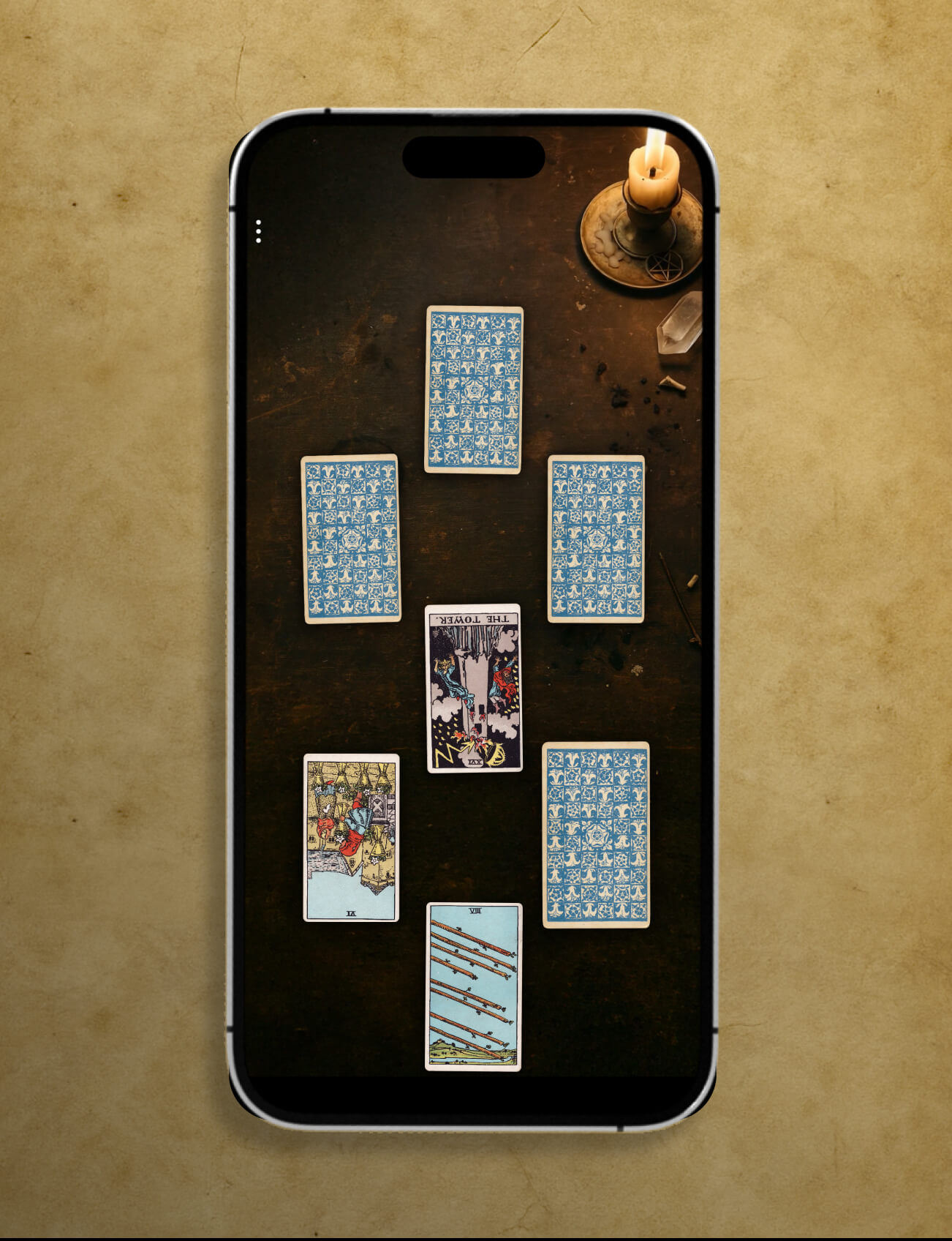 The cards are laid out in a spread. Each has its own meaning, but together they form a pattern that reflects your situation. Tarot 1887 includes Card of the Day, Three Card, Celtic Cross, Horseshoe, and Double Triad spreads, each offering a different way to see the moment.